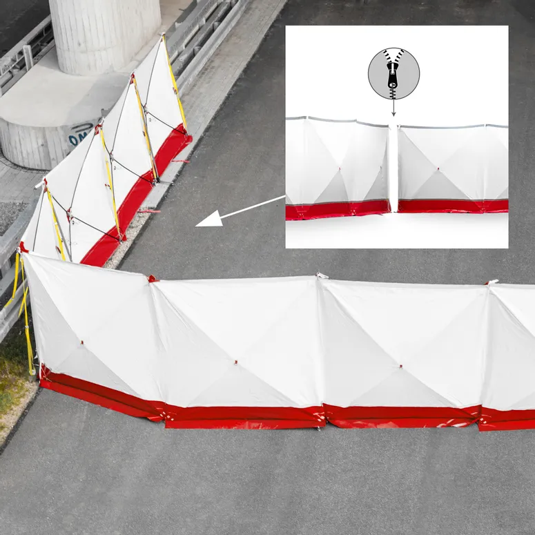 Each screen measures approximately 7 m x 1.8 m and is equipped with metallic protectors for maximum safety during use. Additionally, each screen comes with two grey reflective tapes for enhanced visibility. The total weight of a screen is about 16 kg.